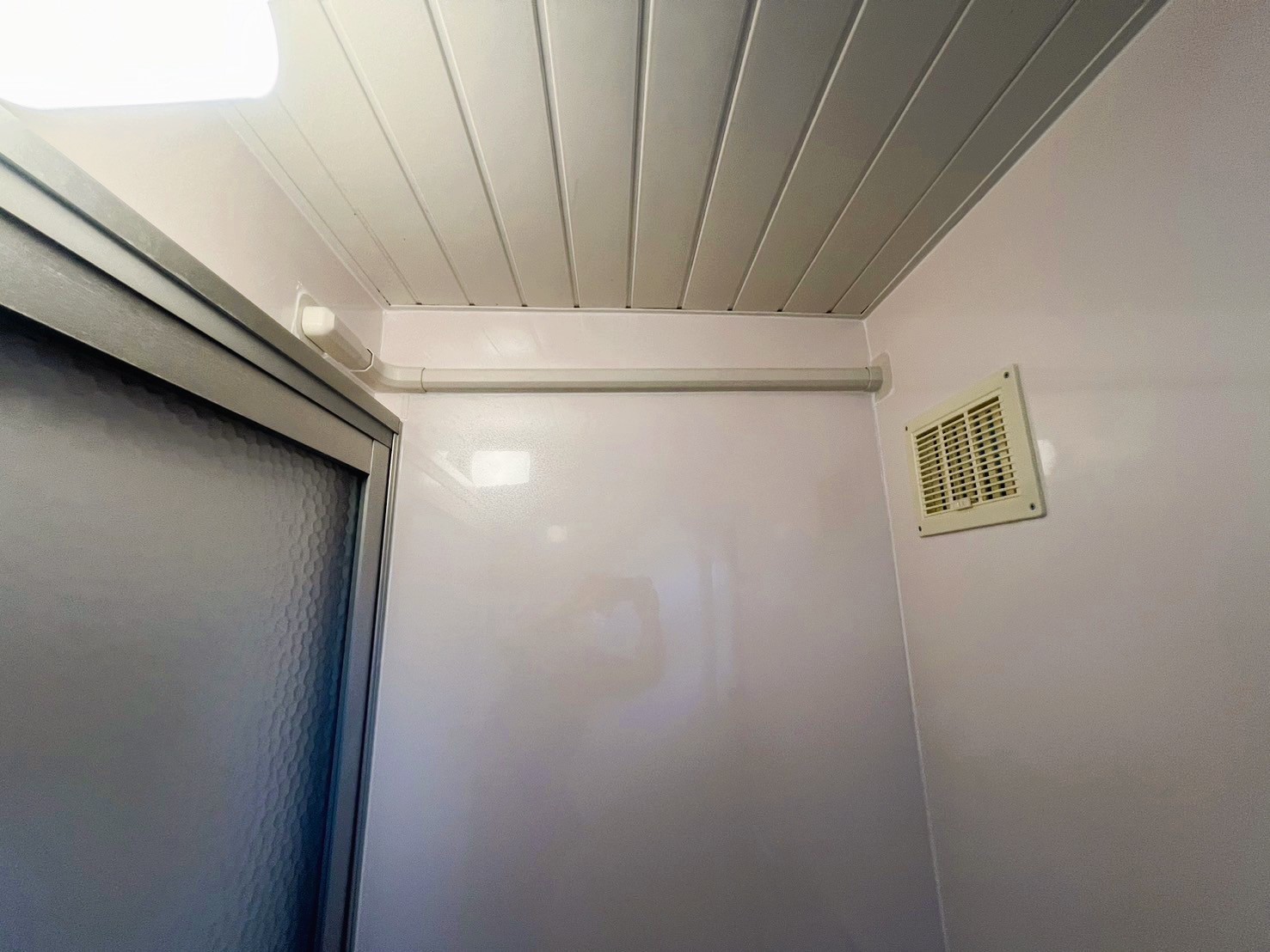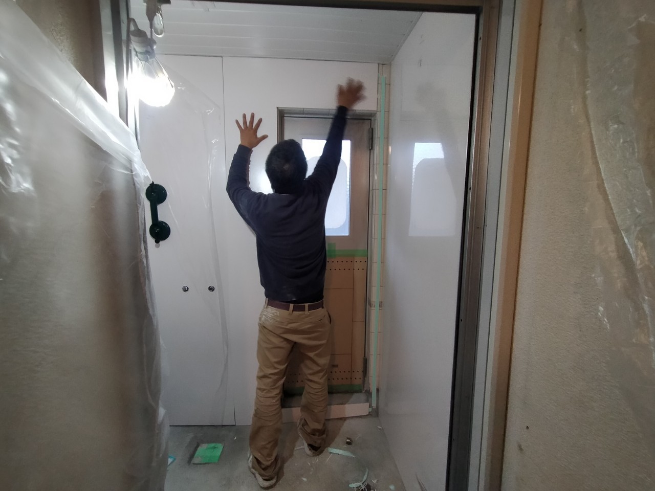 次に壁面に入ります。浴室パネルを寸法にカットし全体に貼り付けていきます。