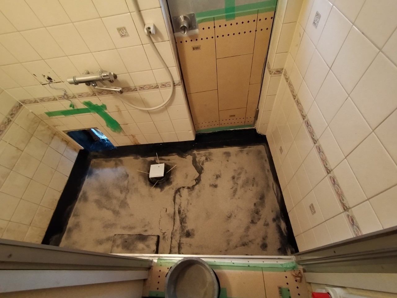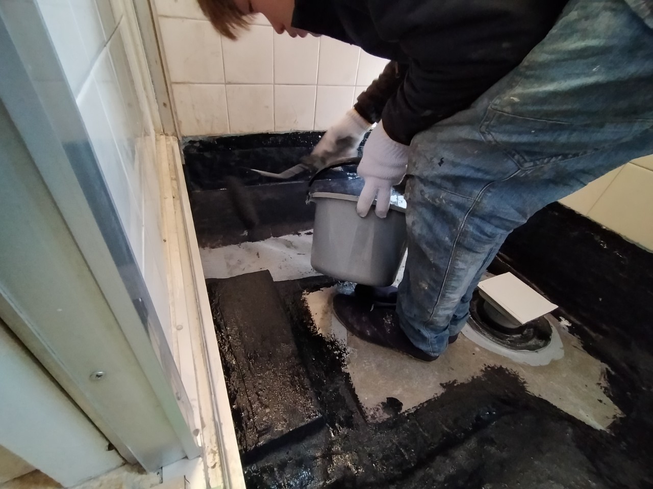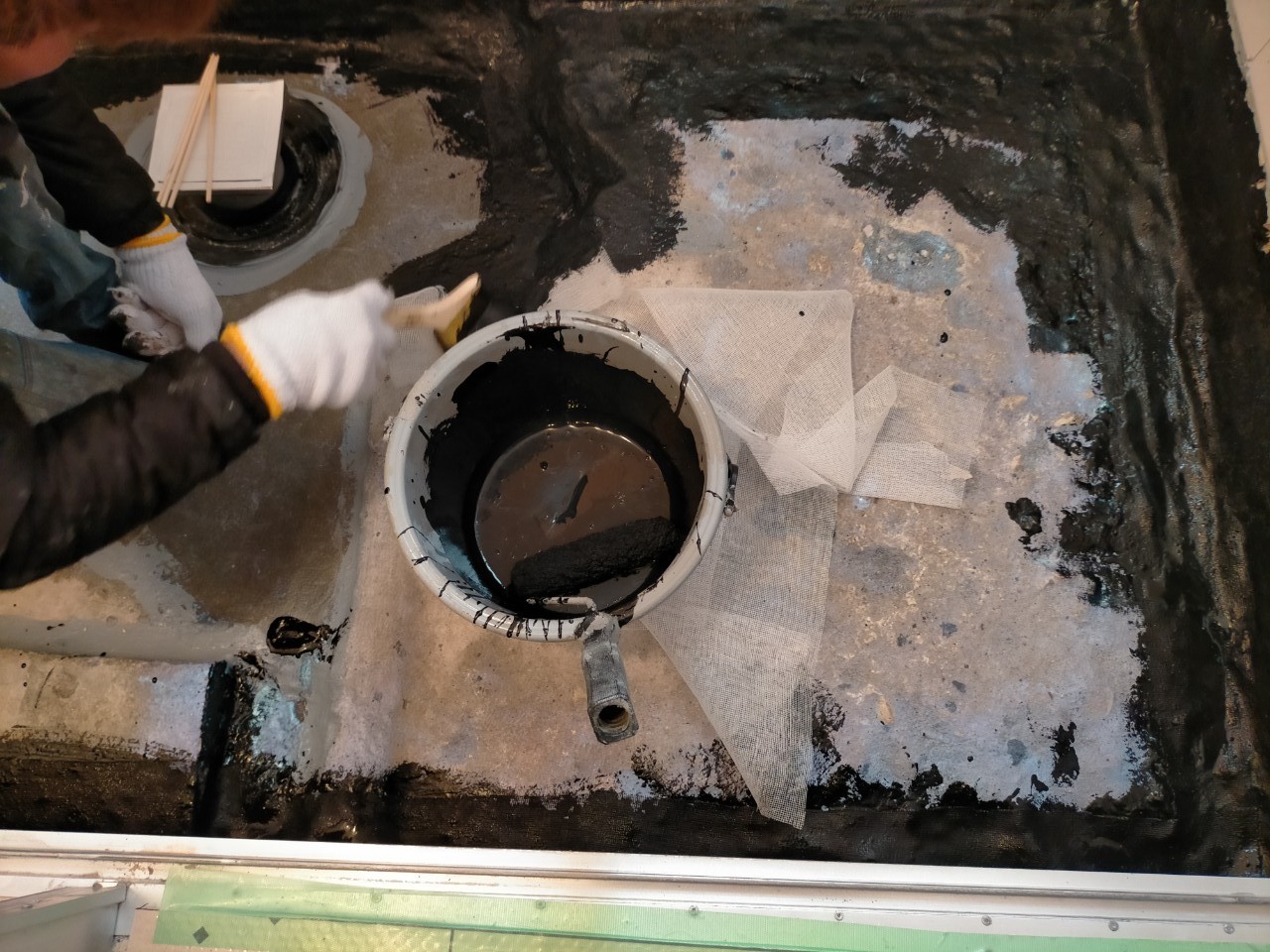 モルタルが乾いたら、再度キレイに掃き掃除を行い、防水加工に入ります。