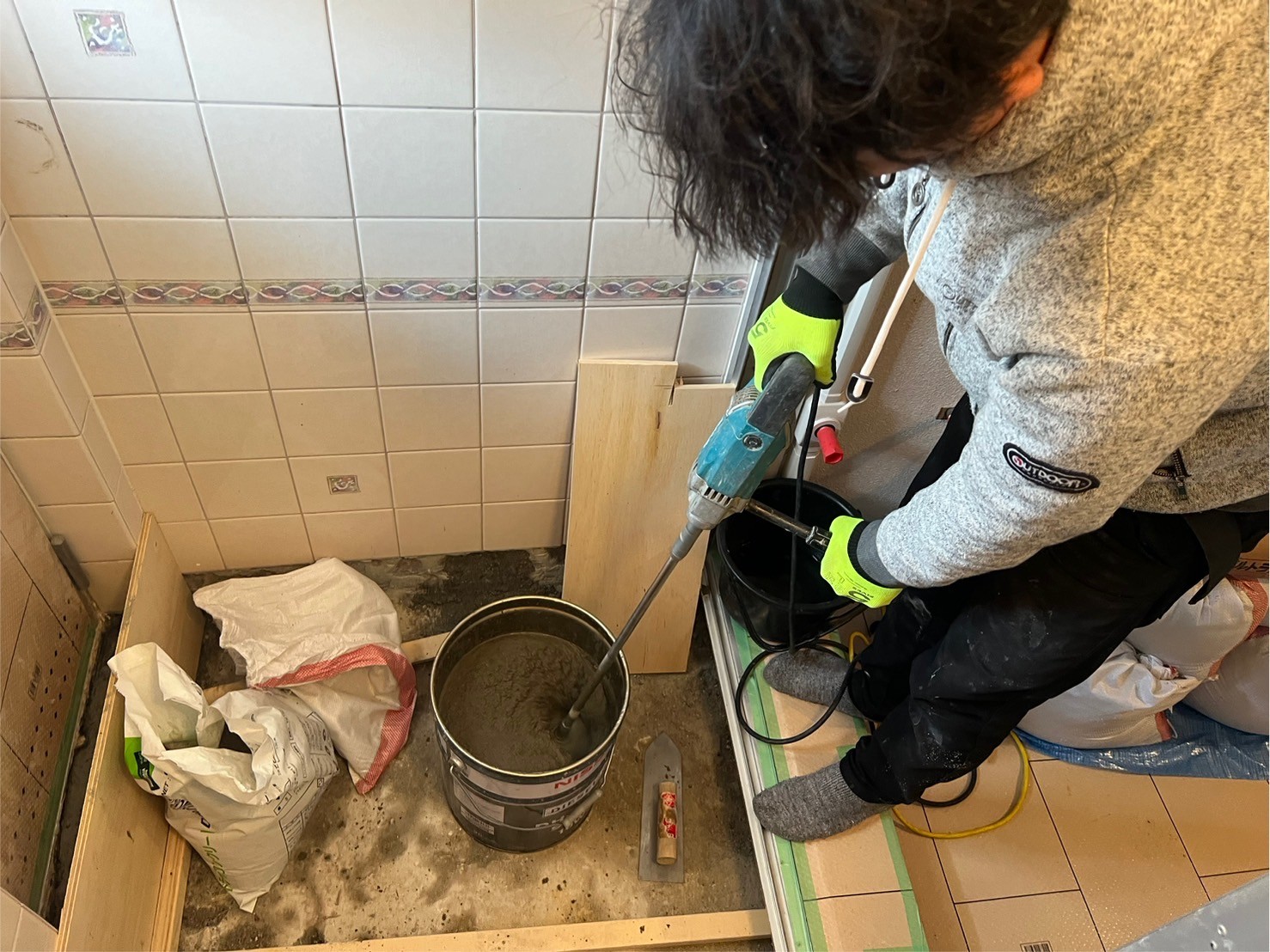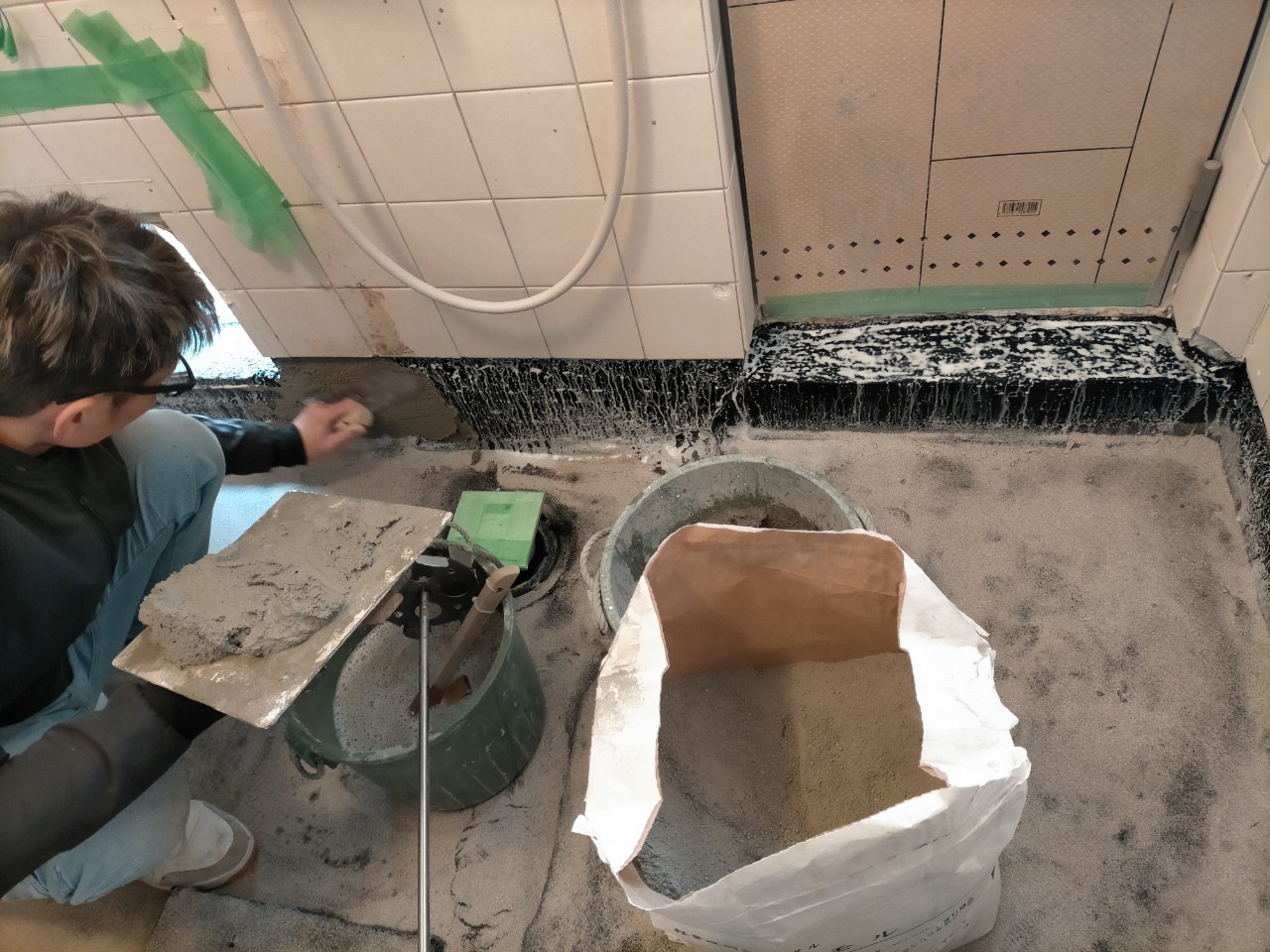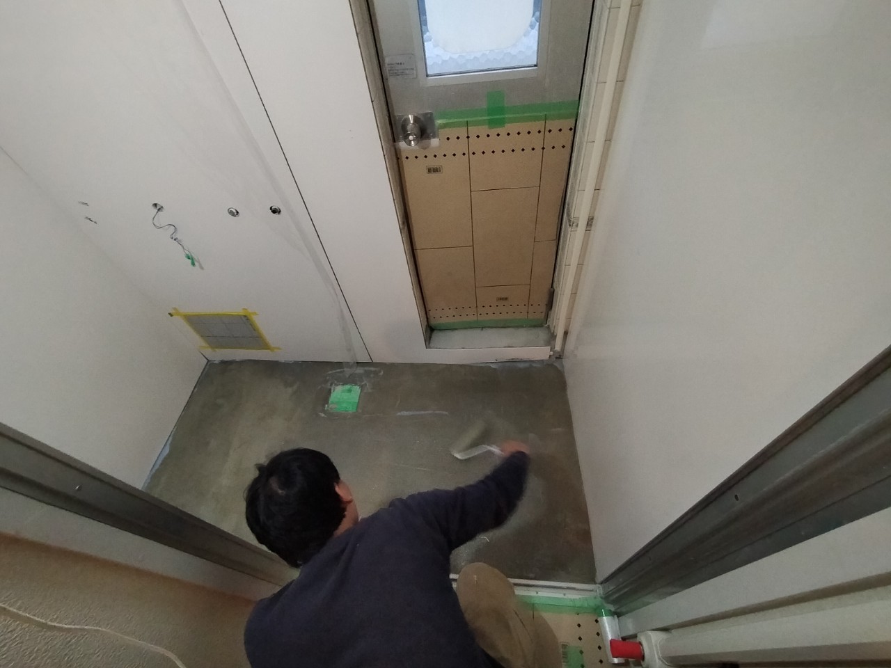 モルタルが乾いたら、再度キレイに掃き掃除を行い、防水加工に入ります。