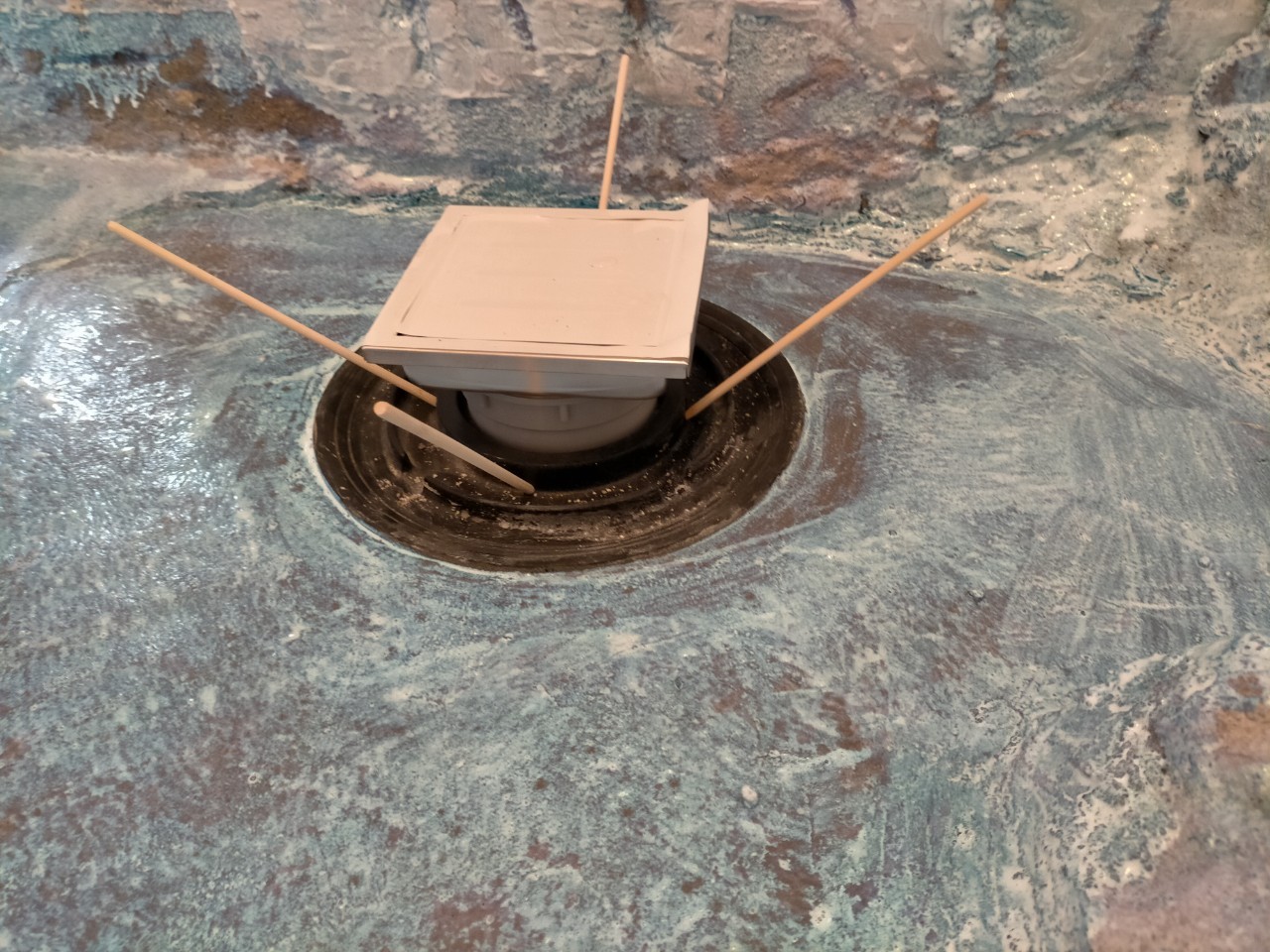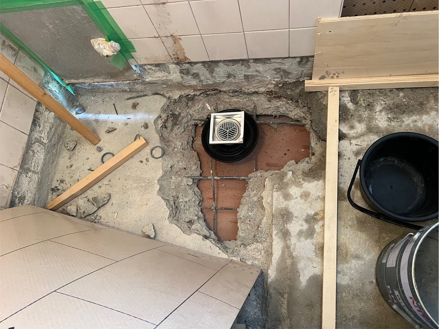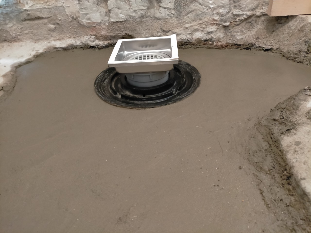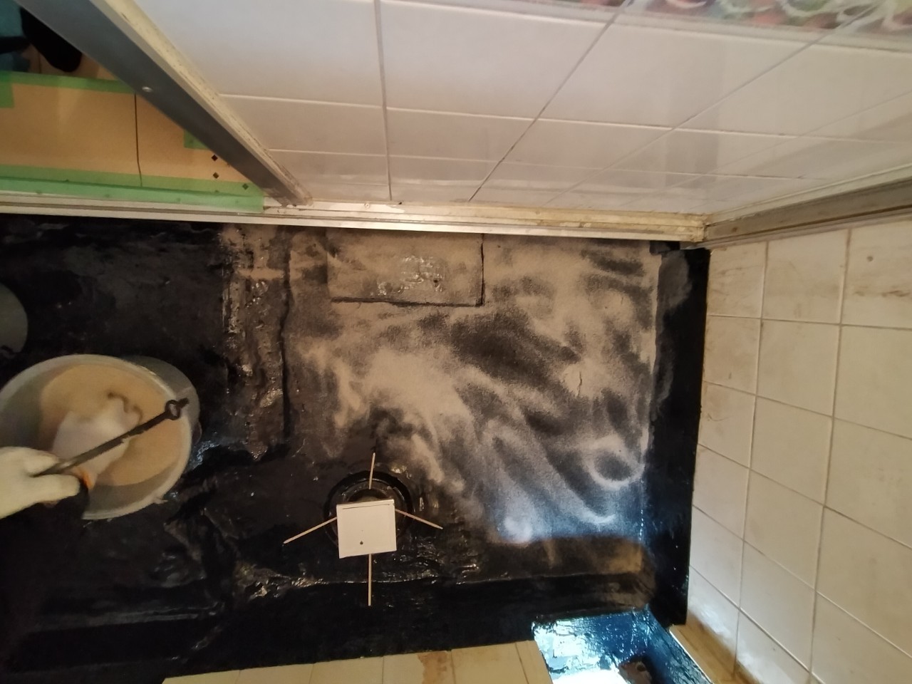 接着剤を塗布し防水押えモルタルを施し、排水金物をしっかり乾かします。