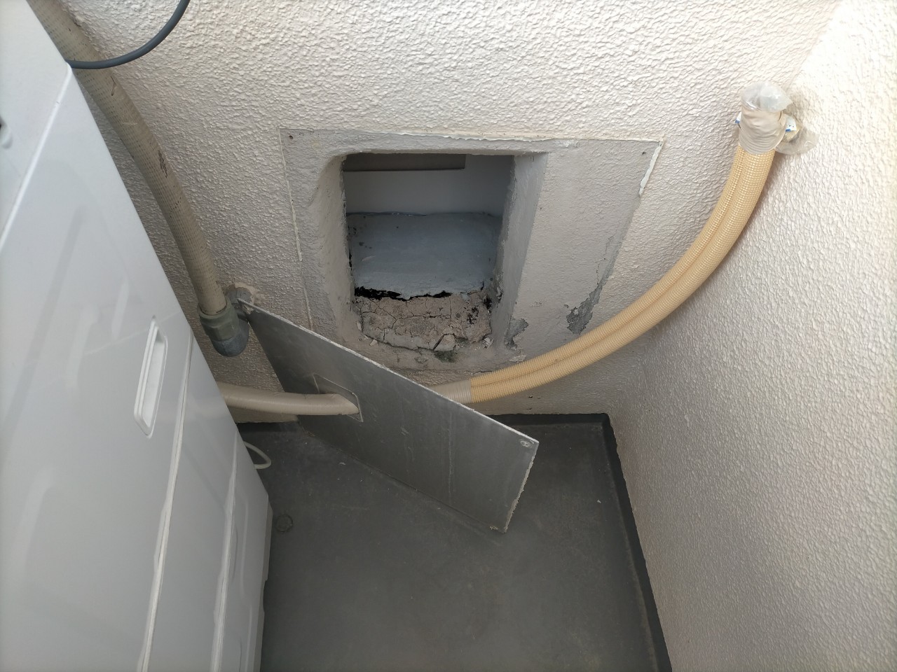 排水口の位置に穴を開け、配管を通します。新しい配管と排水ユニットを取付けていきます。
