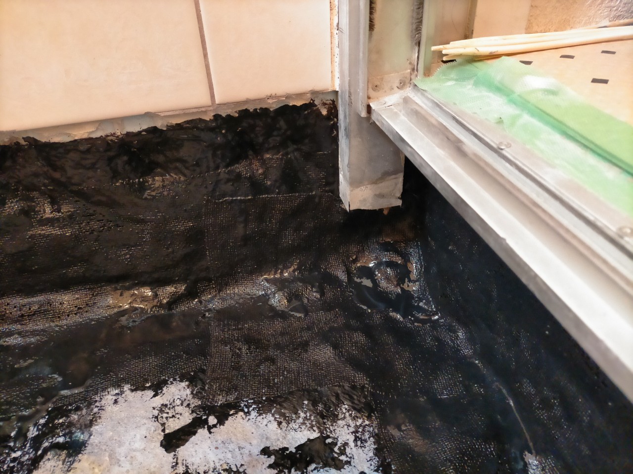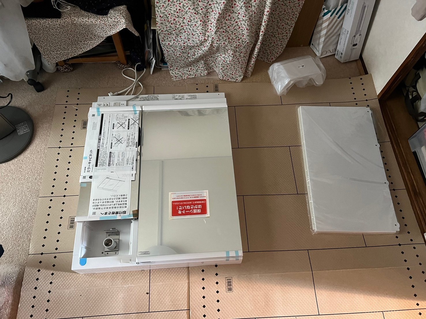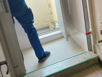浴室用床シートを貼り浴槽と浴室扉を元に戻します。