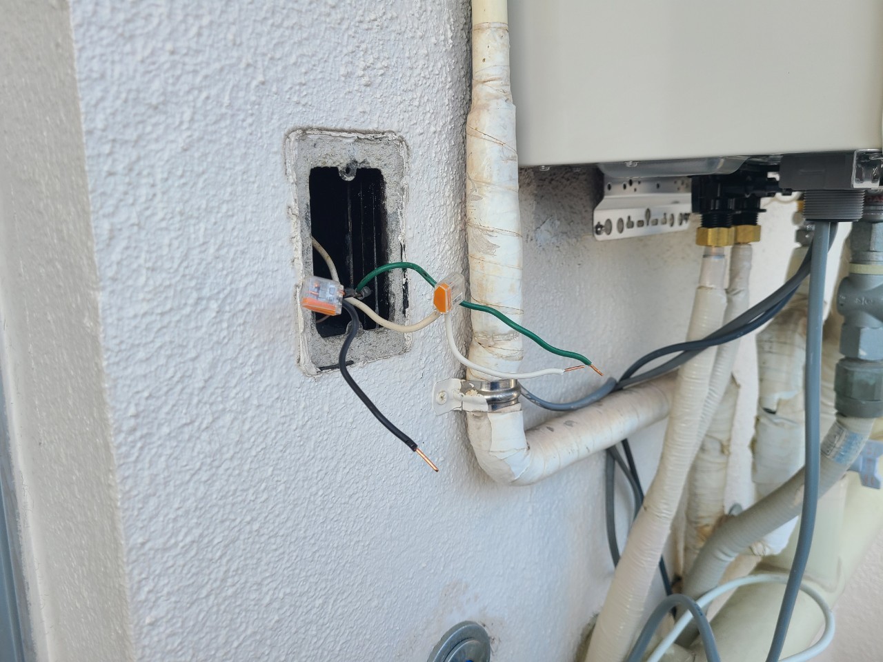 給湯器の配管を分岐し、ベランダの上部から浴室を通ってキッチンへお湯を供給します。