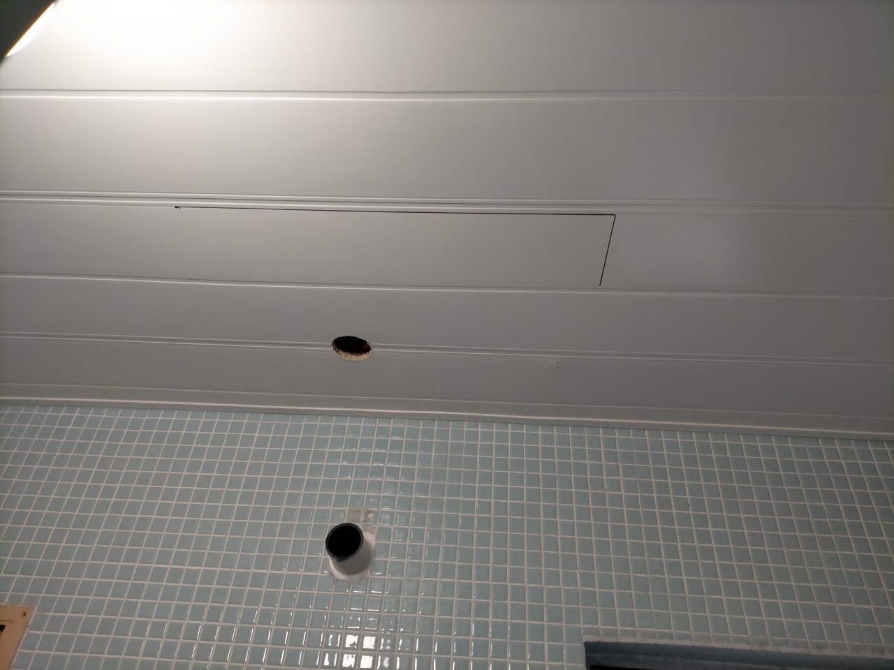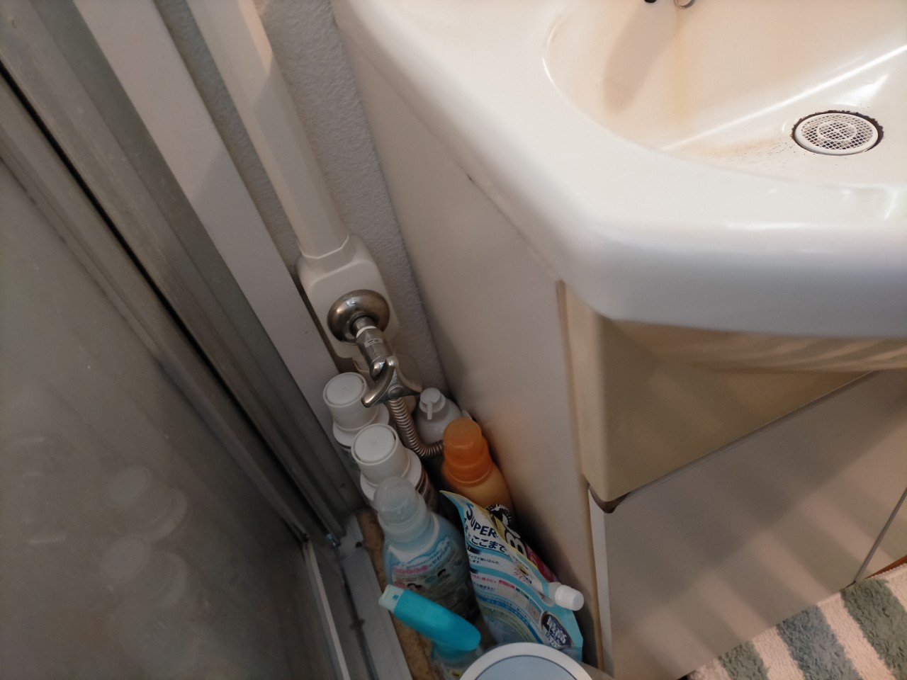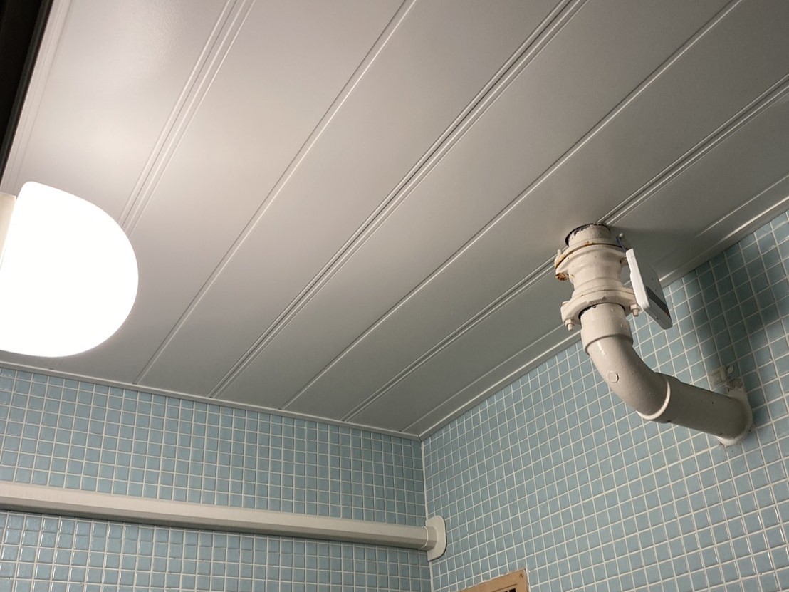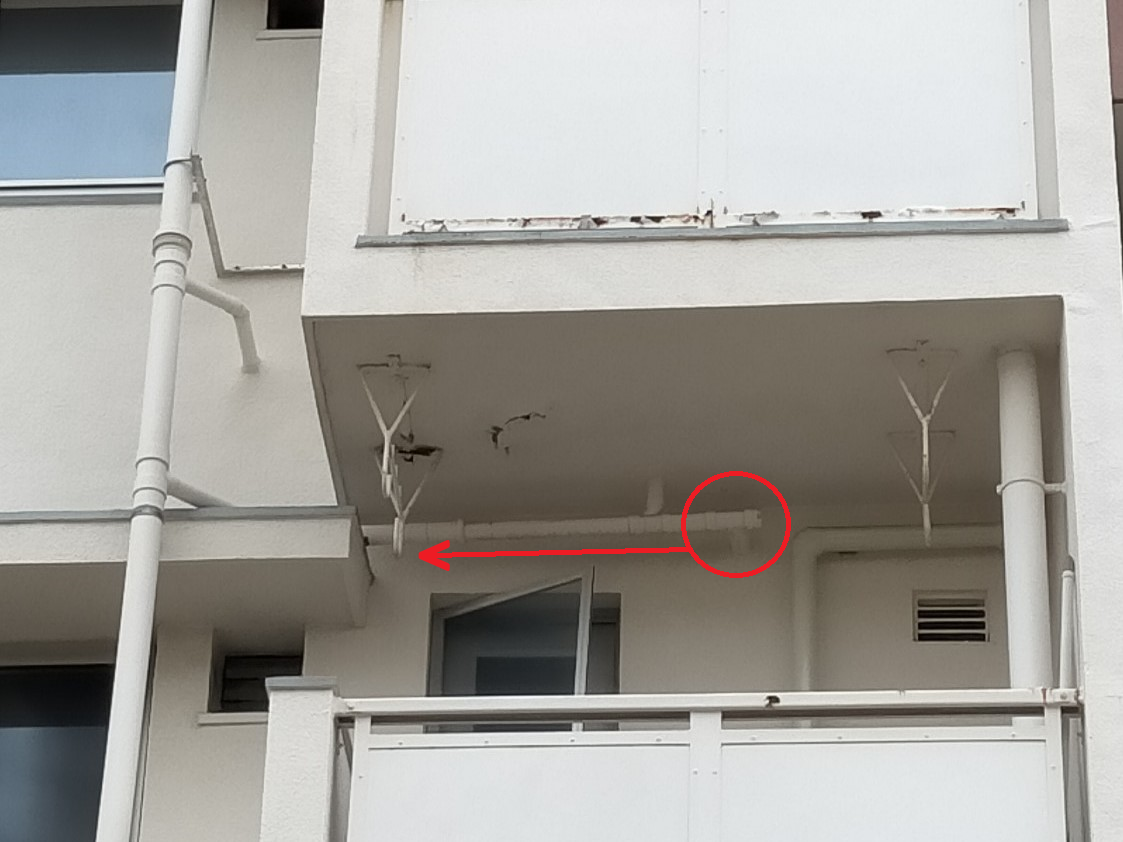 こちらの団地は上の階の排水管が下の階の天井に露出した状態で通り、側面からベランダを通過し共有の排水管に合流する形でした。