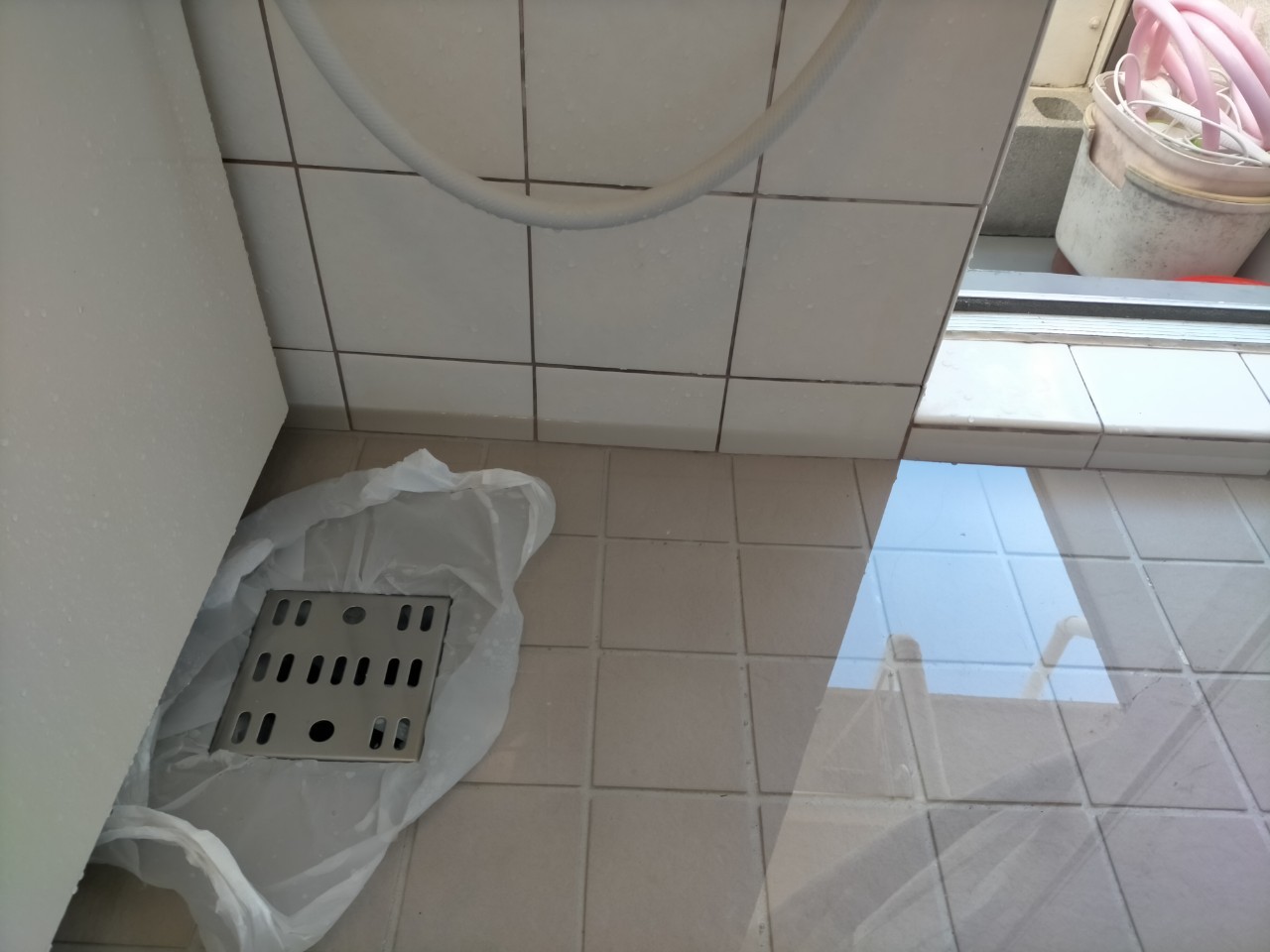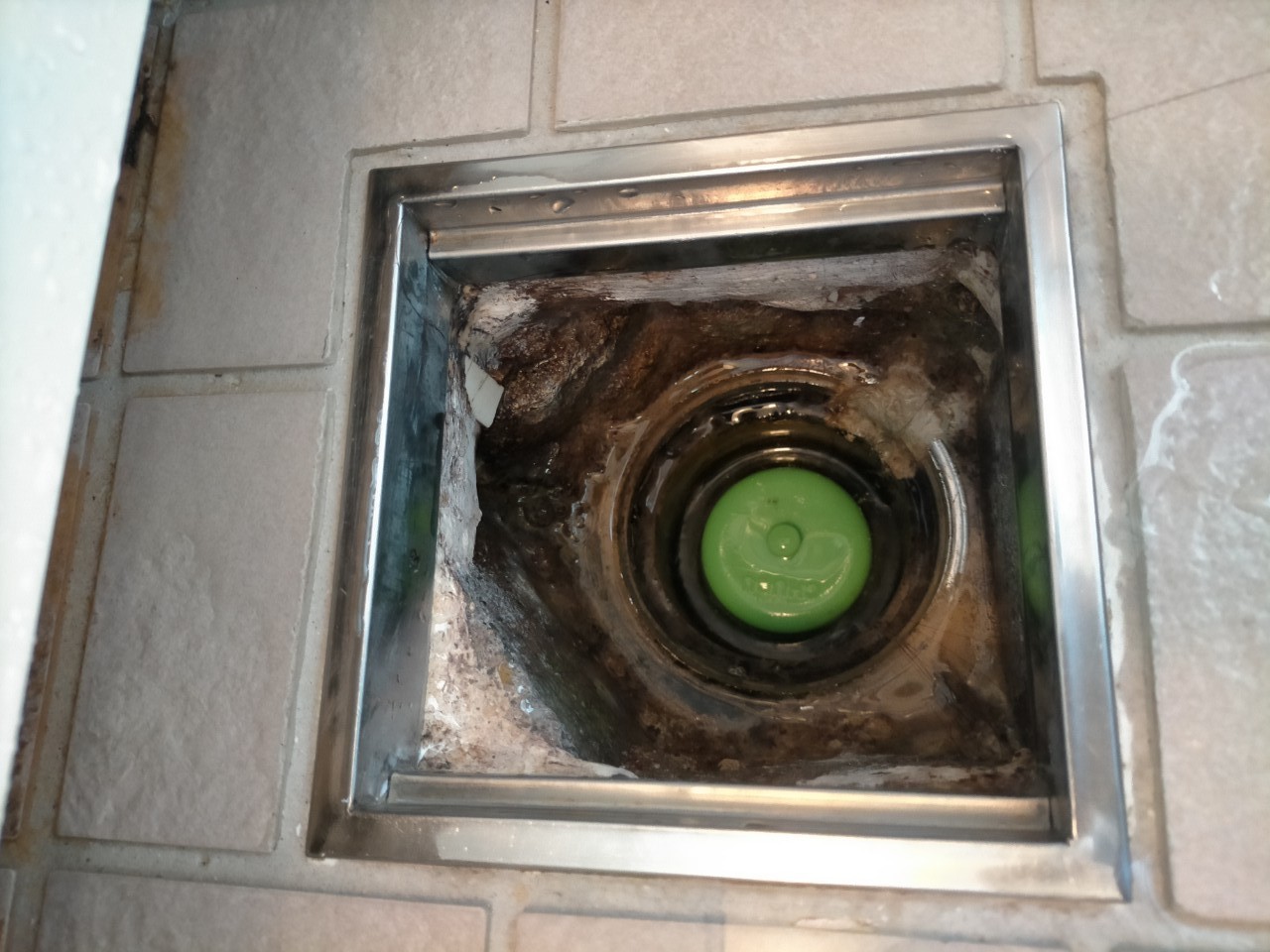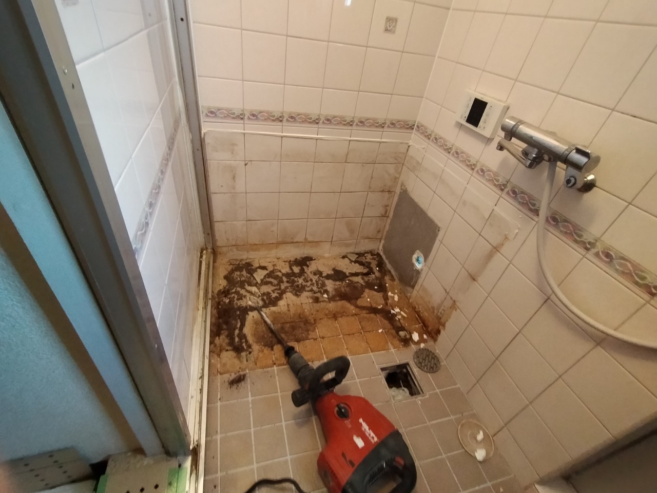 排水口の老朽化、コーキングの劣化、床の防水機能の老朽化により、漏水していたと考えられます。既存の排水口を撤去します。
