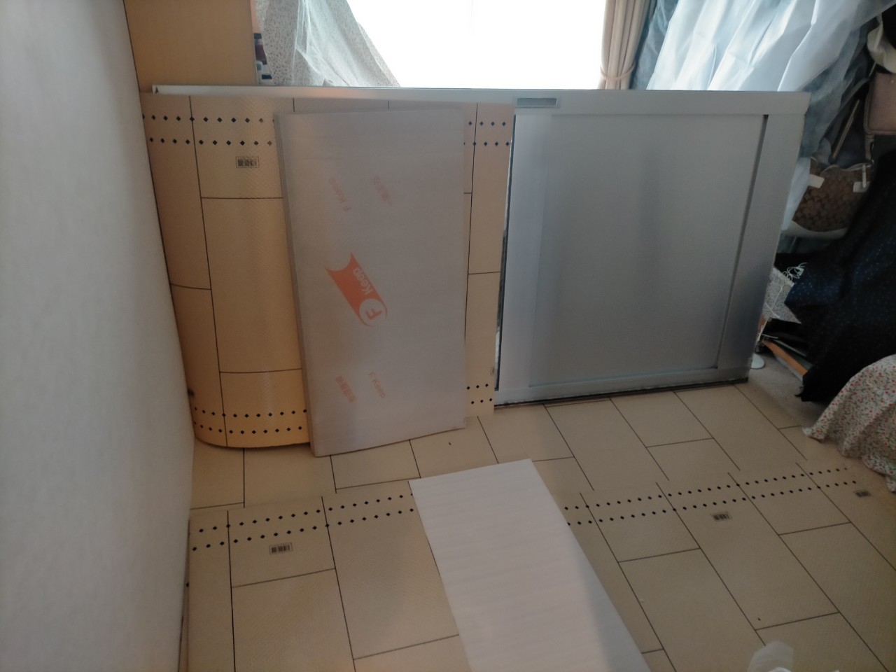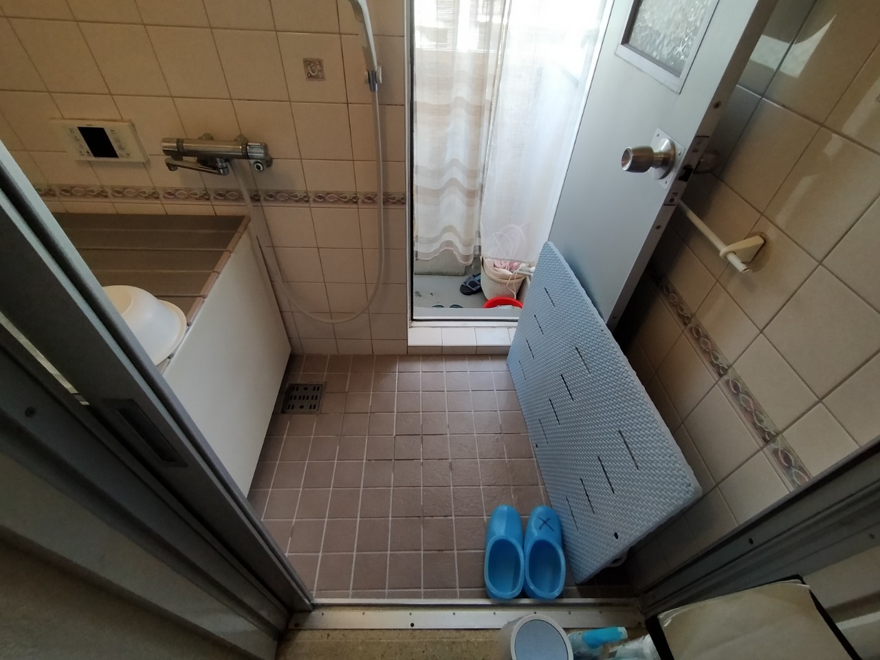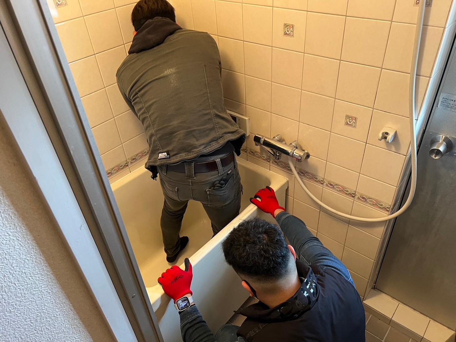 浴槽と浴室の引き戸を一旦撤去し別の部屋に仮置きしておきます。