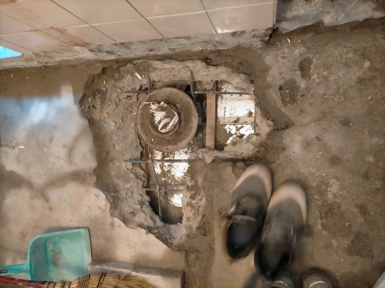 既存の排水管をカットし取り外します。天井をカットし、腐食が進んだ金属の型枠を取外しました。