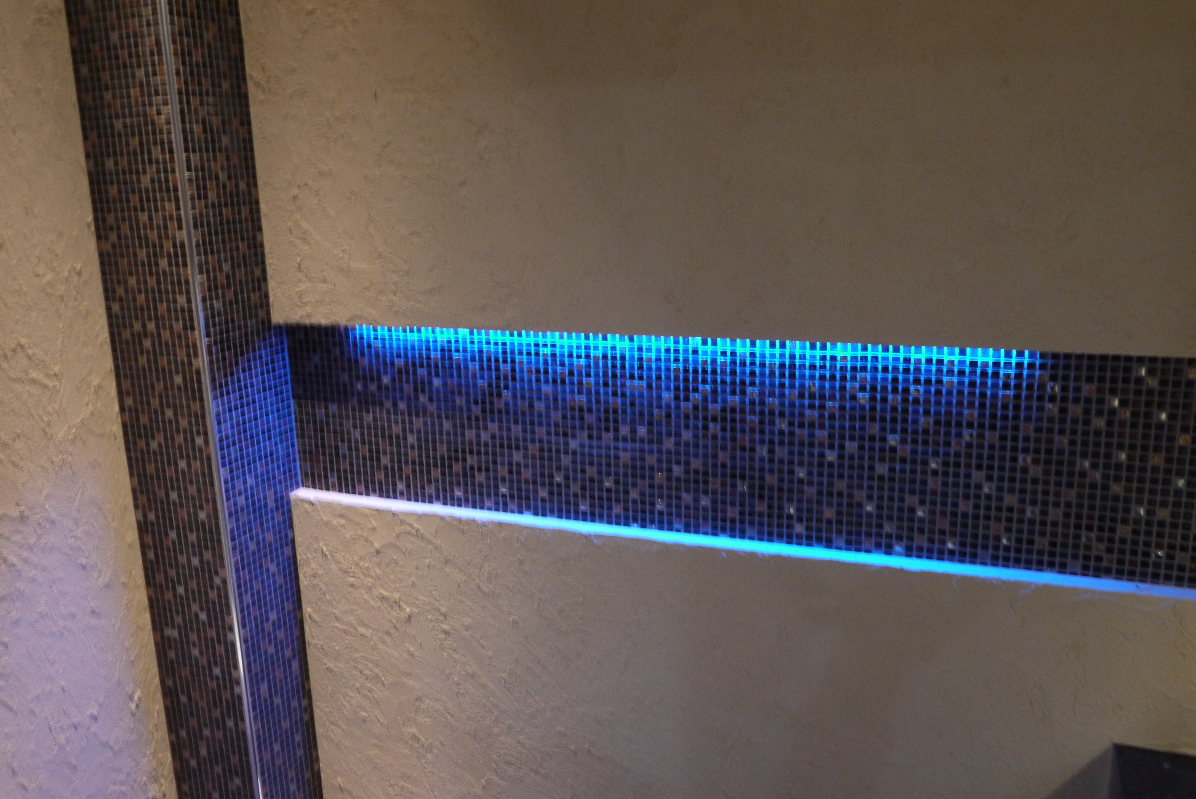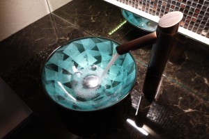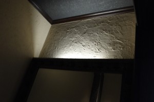 壁の間に空間を作り、間接照明を付けることで手洗い鉢とコーディネートしました。