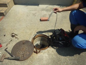 小型カメラで配水管の中にゴミが残ってないかをチェックします。