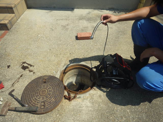 詰まりの原因となっていた木の根を取り除いてから、まだパイプの周りに残っているゴミを取る為にノズル先が違うタイプの高圧洗浄機を使い取り除いていきます。