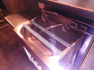 シンクの水跳板に補強を入れて座付水栓を取付し給水管・給湯管の設置配管をしました。