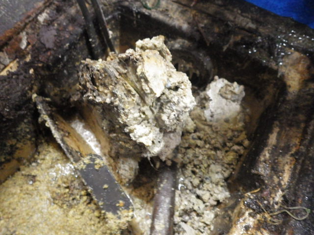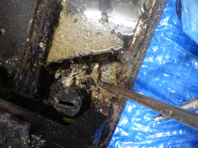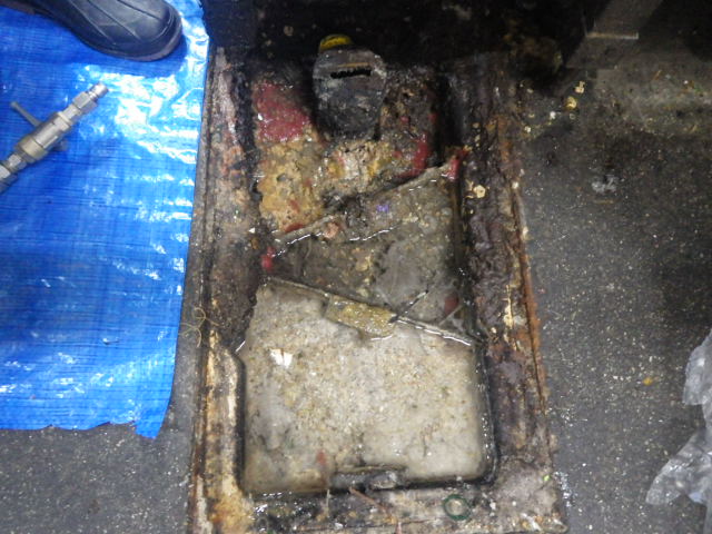 まず、グリストラップに溜まっている油脂と固形物を取り除いていきます。
