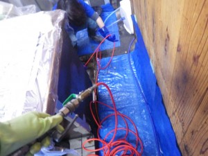 お客様より排水口から水が逆流してくるとのことでしたので、油脂や固形物を全て取り除いたらシンクの排水口からグリストラップまでの排管部分を高圧洗浄していきます。