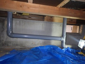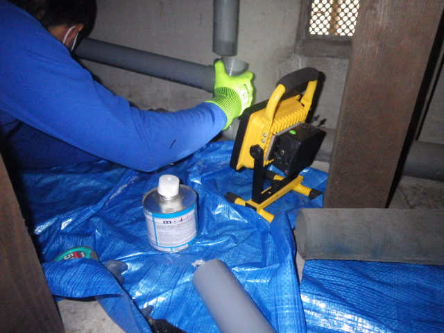 床下に通っているキッチンシンクの排水管にチーズ(T字管)を取り付け洗濯用排水管を繋げ排水するように施工しました。